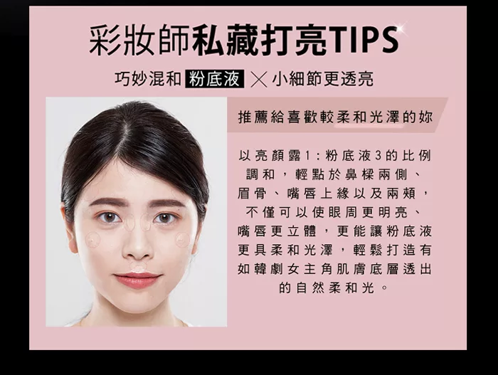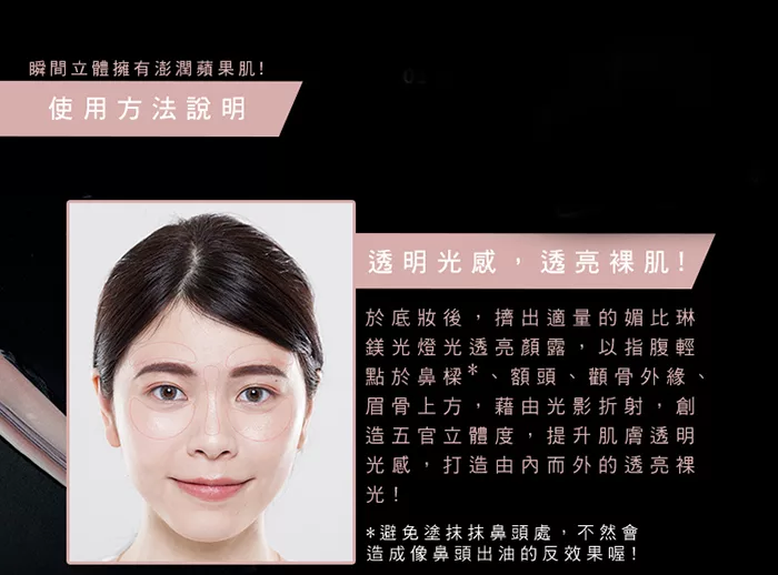於粉底液後,擠出適量的媚比琳鎂光燈光透亮顏露,以指腹輕點於鼻樑、額頭、顴骨外緣、唇峰、下巴,藉由光影折射,創造五官立體度,提升肌膚透明光感,打造由內而外的透亮裸光!
