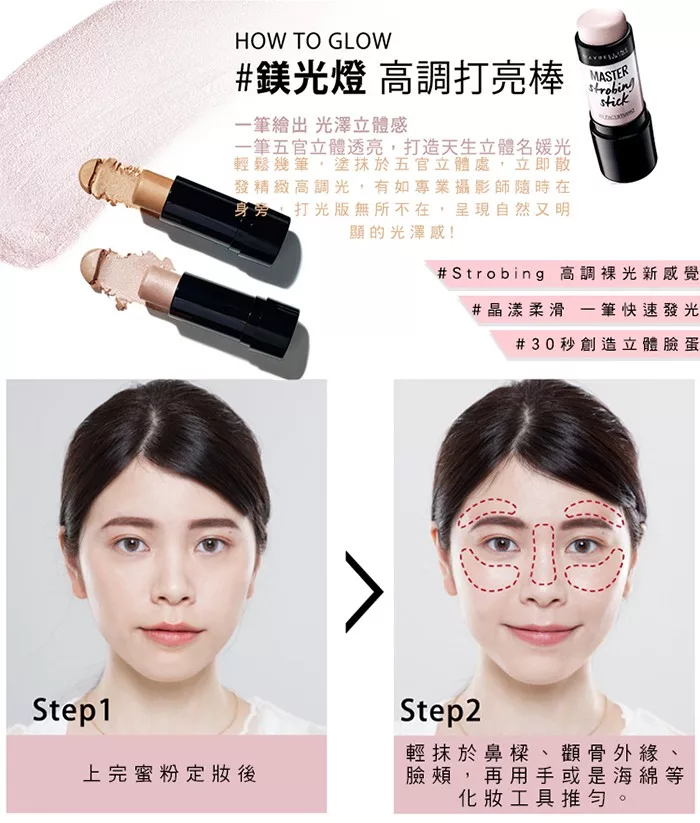 為了因應不同消費者對於打亮產品的需求,此次媚比琳MAYBELLINE NEW YORK推出的兩款互異質地的打亮產品「媚比琳鎂光燈光透亮顏露」&「媚比琳鎂光燈高調打亮棒」,除了都添加含有高科技折射微粒的霓光折射因子,針對想要為臉部妝容增添自然透亮感的女生,推薦可使用薄透水潤霜狀質地的「媚比琳鎂光燈光透亮顏露」,超保濕易延展的特性除了塗抹於臉部也能同時擦拭於鎖骨及手臂上達到顯瘦視覺效果;而若是想要讓五官有明顯立體度,則可選擇棒狀的「媚比琳鎂光燈高調打亮棒」,訴求只要輕輕一筆就能快速發光,沒有市面上一般品牌打亮棒易見的卡粉、起屑困擾,卻能輕鬆打造出微整型般的修飾度,另外「媚比琳鎂光燈高調打亮棒」是屬於偏霧面感的打亮妝效,完全不必擔心會發生一打亮就讓毛孔現形的窘境!對毛孔較為粗大的女生來說,是能輕鬆上手的一款打亮產品!