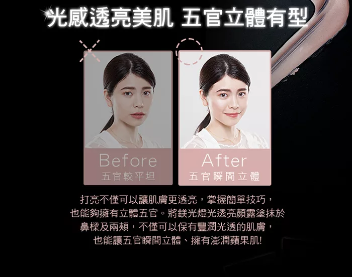 對許多女性來說,在底妝這一步驟常常都是只上粉底液OR粉餅後就算OK!但其實若想打造一個讓臉部透出細緻透亮光感的妝容,絕不能忽略最新潮流趨勢〝STROBING亮膚光魔法〞!尤其是嚮往韓劇女主角或巨星名媛們呈現的薄透無瑕卻又充滿光澤感的膚質,底妝有沒有加上打亮這一步驟才是致勝關鍵!