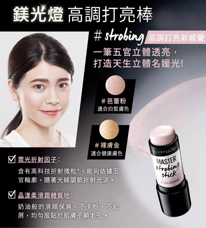 想輕鬆變身名媛好命肌,妳一定要試試在底妝後加上「媚比琳鎂光燈光透亮顏露」&「媚比琳鎂光燈高調打亮棒」的STROBING亮膚光魔法,透亮美顏效果絕對驚豔四座!