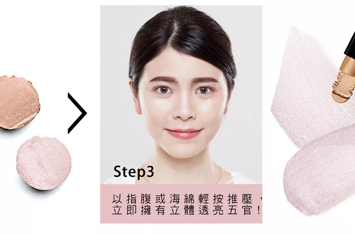 底妝沒打亮,即使完妝度再高但整體妝容就是顯得平淡無光彩,唯有選擇適合的打亮產品找出臉部部位的最高點,如鼻樑、額頭、顴骨外圍、唇峰及下巴處打光提亮,增加這些部位的反光度,讓臉龐散發出自然不厚重的輕透光澤感,同時也能透過光源照射讓臉部呈現明暗對比,讓平坦五官瞬間變成立體小臉。